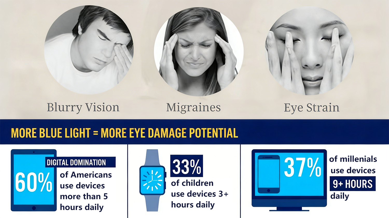 It filters harmful blue light from phones, computers, tablets, TVs, and games to help reduce eye strain, dryness, and headaches.